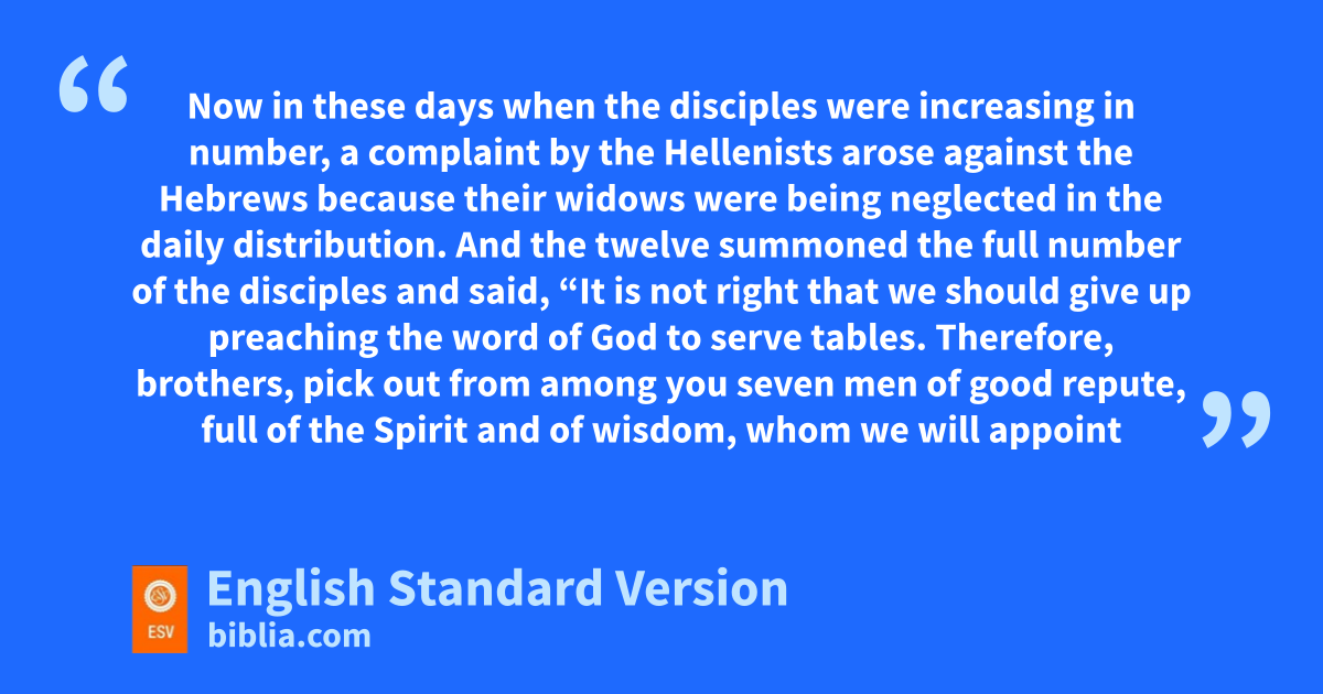 6 Now in these days kwhen the disciples were increasing in number, a complaint by the Hellenists1 arose against the Hebrews because their widows were being neglected in lthe daily distribution. 2 And the twelve summoned the full number of the disciples and said, “It is not right that we should give up preaching the word of God to serve tables. 3 mTherefore, brothers,2 pick out from among you seven men nof good repute, ofull of the Spirit and of wisdom, whom we will appoint to this duty. 4 But pwe will devote ourselves to prayer and to the ministry of the word.” 5 And what they said pleased the whole gathering, and they chose Stephen, qa man full of faith and rof the Holy Spirit, and sPhilip, and Prochorus, and Nicanor, and Timon, and Parmenas, and Nicolaus, ta proselyte of Antioch. 6 These they set before the apostles, and uthey prayed and vlaid their hands on them.