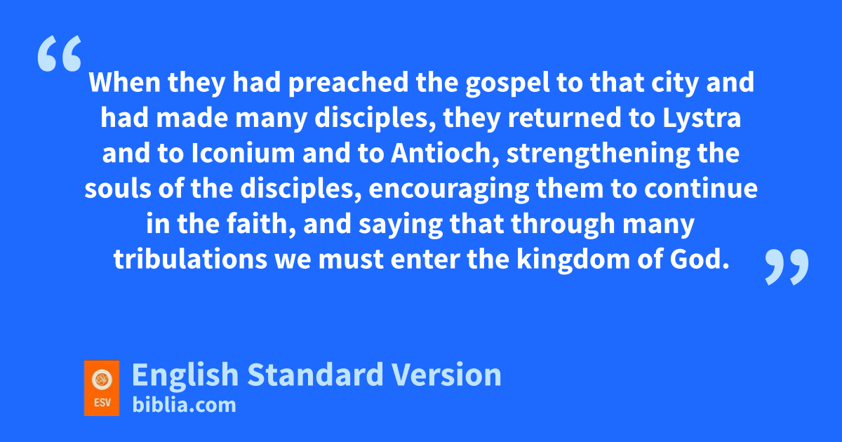 19 iBut Jews came from Antioch and Iconium, and having persuaded the crowds, jthey stoned Paul and dragged him out of the city, supposing that he was dead. 20 But when the disciples gathered about him, he rose up and entered the city, and on the next day he went on with Barnabas to Derbe. 21 When they had preached the gospel to that city and had kmade many disciples, they returned to Lystra and to Iconium and to Antioch, 22 lstrengthening the souls of the disciples, encouraging them mto continue in nthe faith, and saying that othrough many tribulations we must enter the kingdom of God. 23 And when they had pappointed qelders for them in every church, with prayer and fasting rthey committed them to the Lord in whom they had believed.