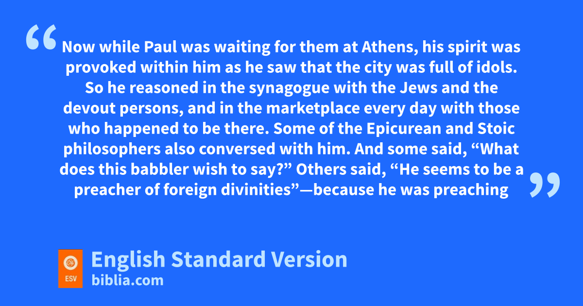 16 Now while Paul was waiting for them at Athens, his spirit was gprovoked within him as he saw that the city was hfull of idols. 17 So ihe reasoned in the synagogue with the Jews and the devout persons, and in the marketplace every day with those who happened to be there. 18 Some of the Epicurean and Stoic philosophers also conversed with him. And some said, j“What does this babbler wish to say?” Others said, “He seems to be a preacher of foreign divinities”—because khe was preaching lJesus and the resurrection. 19 And they took him and brought him to mthe Areopagus, saying, “May we know what this nnew teaching is that you are presenting? 20 For you bring some ostrange things to our ears. We wish to know therefore what these things mean.” 21 Now all the Athenians and the foreigners who lived there would spend their time in nothing except telling or hearing something new.