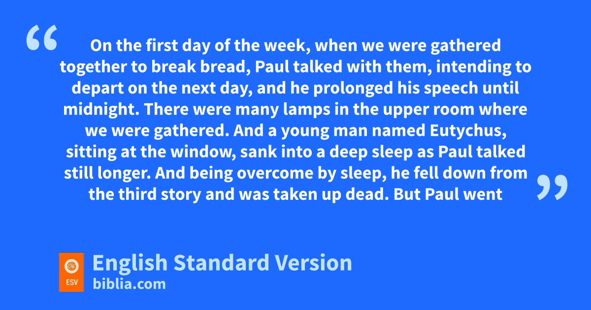 7 zOn the first day of the week, when we were gathered together ato break bread, Paul talked with them, intending to depart on the next day, and he prolonged his speech until midnight. 8 There were many lamps in bthe upper room where we were gathered. 9 And a young man named Eutychus, sitting at the window, sank into a deep sleep as Paul talked still longer. And being overcome by sleep, he cfell down from the third story and was taken up dead. 10 But Paul went down and dbent over him, and taking him in his arms, said, e“Do not be alarmed, for his life is in him.” 11 And when Paul had gone up and fhad broken bread and eaten, he conversed with them a long while, until daybreak, and so departed. 12 And they took the youth away alive, and were not a little comforted.
