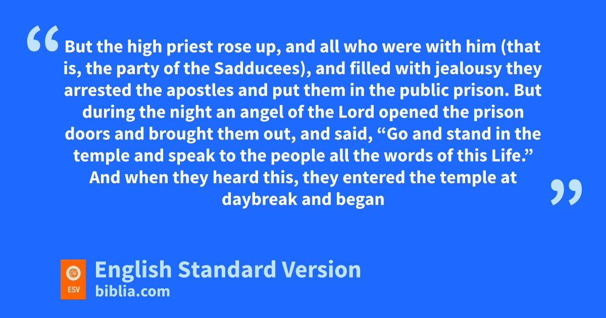 17 But the high priest rose up, and all who were with him (that is, the party of qthe Sadducees), and filled with rjealousy 18 they arrested the apostles and sput them in the public prison. 19 But during the night tan angel of the Lord uopened the prison doors and brought them out, and said, 20 “Go and stand in the temple and speak to the people all vthe words of wthis xLife.” 21 And when they heard this, ythey entered the temple zat daybreak and began to teach.