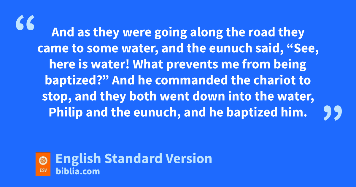 34 And the eunuch said to Philip, “About whom, I ask you, does the prophet say this, about himself or about someone else?” 35 Then Philip opened his mouth, and wbeginning with this Scripture xhe told him the good news about Jesus. 36 And as they were going along the road they came to some water, and the eunuch said, “See, here is water! yWhat prevents me from being baptized?”5 38 And he commanded the chariot to stop, and they both went down into the water, Philip and the eunuch, and he baptized him. 39 And when they came up out of the water, zthe Spirit of the Lord acarried Philip away, and the eunuch saw him no more, and went on his way rejoicing. 40 But Philip found himself at Azotus, and as he passed through he preached the gospel to all the towns until he came to Caesarea.