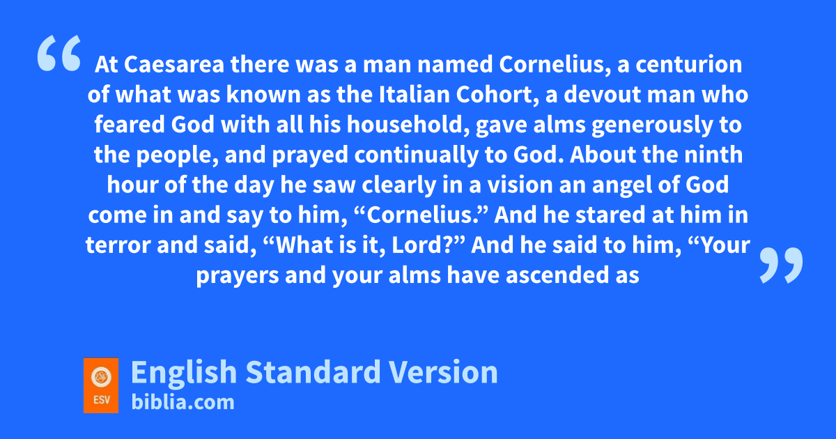 10 At Caesarea there was a man named Cornelius, a centurion of wwhat was known as the Italian Cohort, 2 a devout man xwho feared God with all his household, gave alms generously to the people, and prayed continually to God. 3 yAbout the ninth hour of the day1 zhe saw clearly in a vision aan angel of God come in and say to him, “Cornelius.” 4 And he stared at him in terror and said, “What is it, Lord?” And he said to him, “Your prayers and your alms bhave ascended cas a memorial before God. 5 And now send men to Joppa and bring one Simon who is called Peter. 6 He is lodging dwith one Simon, a tanner, whose house is by the sea.” 7 When the angel who spoke to him had departed, he called two of his servants and a devout soldier from among those who attended him, 8 and having related everything to them, he sent them to Joppa.