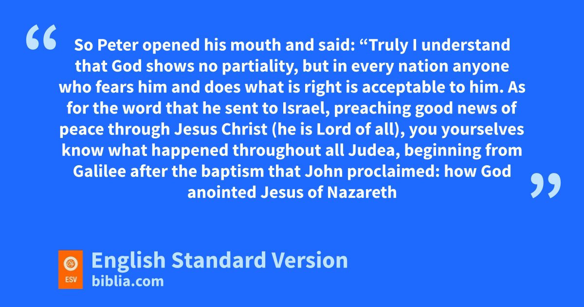 34 So Peter opened his mouth and said: “Truly I understand that fGod gshows no partiality, 35 but fin every nation anyone who fears him and hdoes what is right is acceptable to him. 36 As for ithe word that he sent to Israel, jpreaching good news of kpeace through Jesus Christ (lhe is Lord of all), 37 you yourselves know what happened throughout all Judea, mbeginning nfrom Galilee after the baptism that John proclaimed: 38 how oGod anointed Jesus of Nazareth pwith the Holy Spirit and with qpower. He went about doing good and healing all rwho were oppressed by the devil, sfor God was with him. 39 And twe are witnesses of all that he did both in the country of the Jews and in Jerusalem. uThey put him to death by hanging him on a tree, 40 but vGod raised him on wthe third day and made him to xappear, 41 ynot to all the people but to us who had been chosen by God as zwitnesses, who ate and drank with him after he rose from the dead. 42 And ahe commanded us to preach to the people and to testify bthat he is the one appointed by God to be judge cof the living and the dead. 43 dTo him eall the prophets bear witness that feveryone who believes in him receives gforgiveness of sins hthrough his name.”