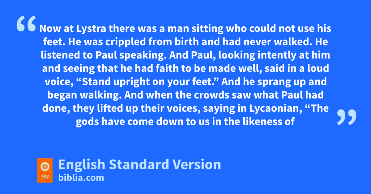 8 Now at Lystra there was a man sitting who could not use his feet. He was ncrippled from birth and had never walked. 9 He listened to Paul speaking. And Paul, looking intently at him and oseeing that he had faith to be made well,2 10 said in a loud voice, “Stand upright on your feet.” And he psprang up and began walking. 11 And when the crowds saw what Paul had done, they lifted up their voices, saying in Lycaonian, q“The gods have come down to us in the likeness of men!” 12 Barnabas they called rZeus, and Paul, Hermes, because he was the chief speaker. 13 And the priest of rZeus, whose temple was at the entrance to the city, brought oxen and garlands to the gates and swanted to offer sacrifice with the crowds. 14 But when the apostles Barnabas and Paul heard of it, they ttore their garments and rushed out into the crowd, crying out, 15 “Men, uwhy are you doing these things? We also are men, vof like nature with you, and we bring you good news, that wyou should turn from these xvain things to ya living God, zwho made the heaven and the earth and the sea and all that is in them. 16 In past generations he aallowed all the nations bto walk in their own ways. 17 Yet che did not leave himself without witness, for he ddid good by egiving you rains from heaven and ffruitful seasons, satisfying your hearts with gfood and hgladness.” 18 Even with these words they scarcely restrained the people from offering sacrifice to them.