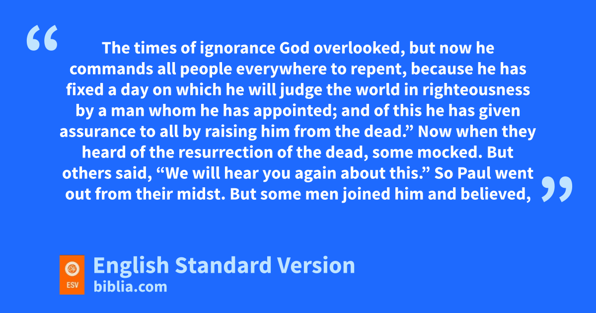 29 gBeing then God’s offspring, hwe ought not to think that the divine being is like gold or silver or stone, an image formed by the art and imagination of man. 30 iThe times of ignorance jGod overlooked, but know he lcommands all people everywhere to repent, 31 because he has fixed ma day on which nhe will judge the world oin righteousness by a man whom he has appointed; and pof this he has given assurance to all qby raising him from the dead.”
