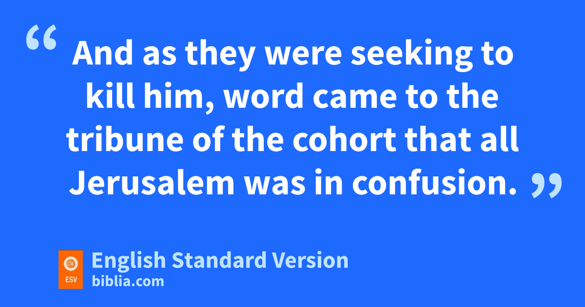 27 When cthe seven days were almost completed, dthe Jews from Asia, eseeing him in the temple, stirred up the whole crowd and laid hands on him, 28 crying out, “Men of Israel, help! This is the man who fis teaching everyone everywhere against the people and gthe law and gthis place. Moreover, he even brought Greeks into the temple and hhas defiled gthis holy place.” 29 For they had previously seen iTrophimus the Ephesian with him in the city, and they supposed that Paul had brought him into the temple. 30 Then all the city was stirred up, and the people ran together. They seized Paul and jdragged him out of the temple, and at once the gates were shut. 31 jAnd as they were seeking to kill him, word came to the tribune of kthe cohort that all Jerusalem was in confusion. 32 lHe at once took soldiers and centurions and ran down to them. And when they saw the tribune and the soldiers, they stopped beating Paul. 33 Then the tribune came up and arrested him and ordered him mto be bound nwith two chains. He inquired who he was and what he had done. 34 oSome in the crowd were shouting one thing, some another. And as he could not learn the facts because of the uproar, he ordered him to be brought into pthe barracks. 35 And when he came to the steps, he was actually carried by the soldiers because of the violence of the crowd, 36 for the mob of the people followed, crying out, q“Away with him!”
