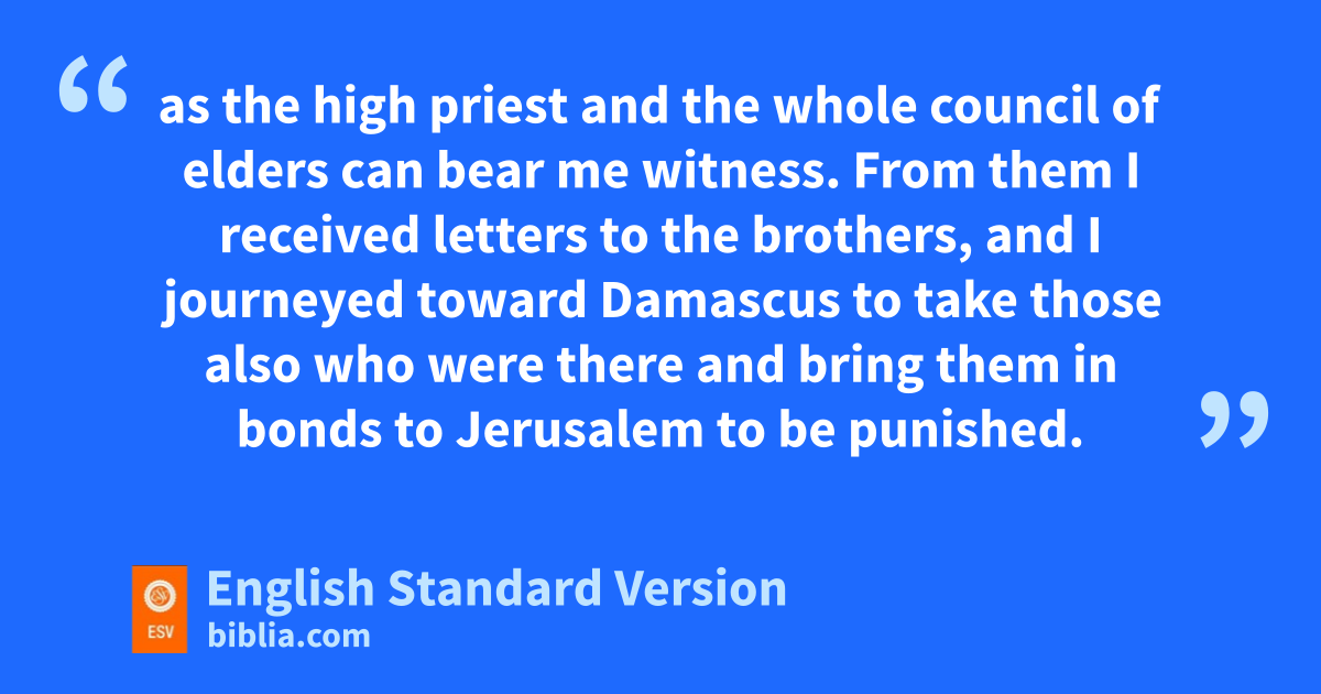 3 y“I am a Jew, born in Tarsus in Cilicia, but brought up in this city, educated zat the feet of aGamaliel2 baccording to the strict manner of the law of our fathers, cbeing zealous for God das all of you are this day. 4 eI persecuted fthis Way gto the death, binding and delivering to prison both men and women, 5 as hthe high priest and ithe whole council of elders can bear me witness. From them I received letters to jthe brothers, and I journeyed toward Damascus to take those also who were there and bring them in bonds to Jerusalem to be punished.