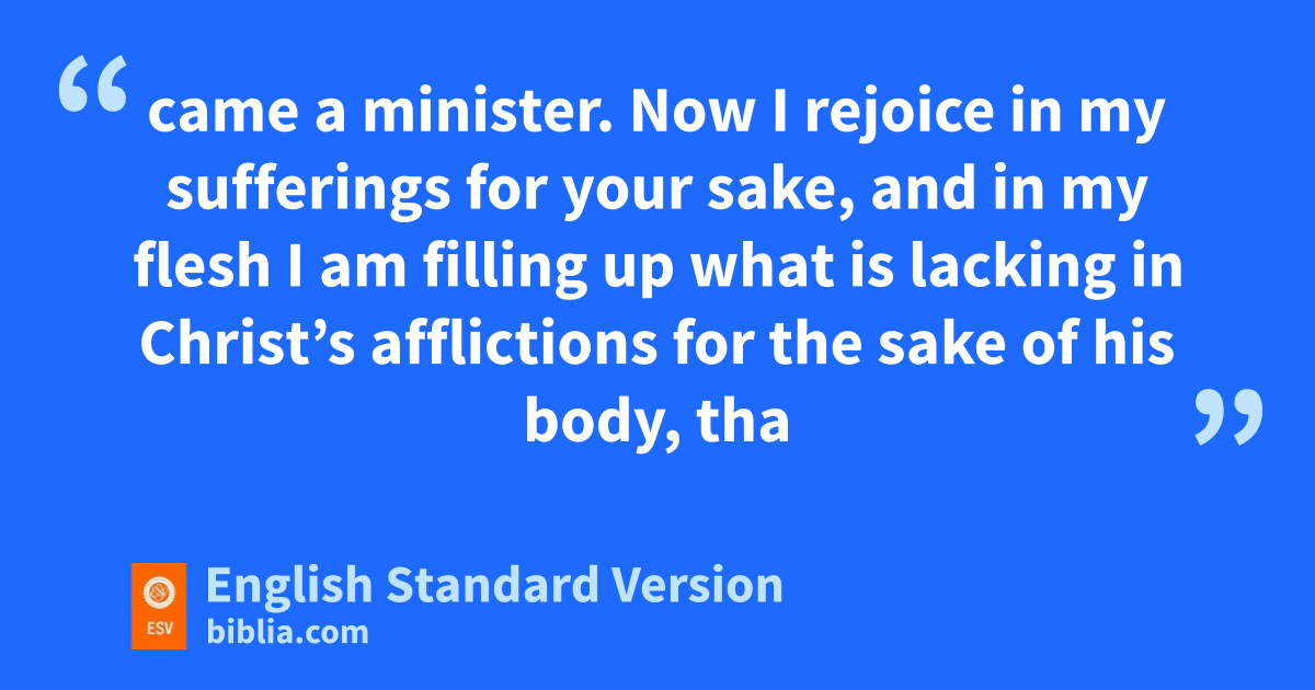 24 Now jI rejoice in my sufferings for your sake, and in my flesh kI am filling up lwhat is lacking in Christ’s afflictions mfor the sake of his body, that is, the church, 25 nof which I became a minister according to othe stewardship from God that was given to me for you, to make the word of God fully known, 26 pthe mystery hidden for ages and generations but now revealed to his saints. 27 qTo them God chose to make known how great among the Gentiles are rthe riches of the glory of pthis mystery, which is Christ in you, sthe hope of glory. 28 Him we proclaim, warning everyone and teaching everyone with all wisdom, that twe may present everyone umature in Christ. 29 For this vI toil, wstruggling xwith all his energy that he powerfully works within me.