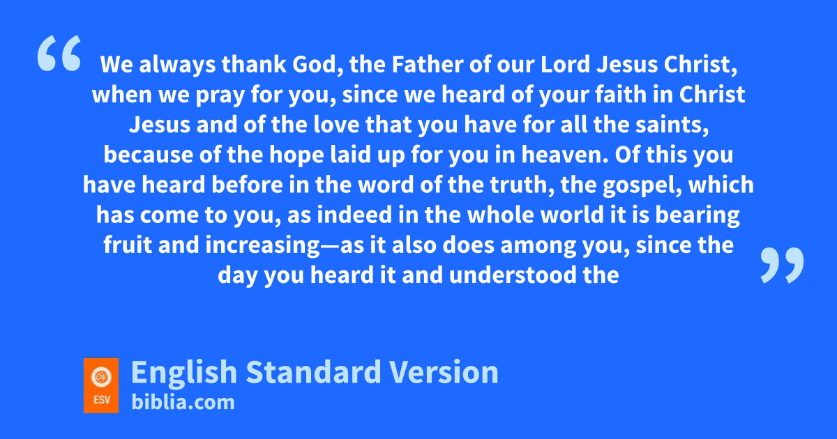3 fWe always thank God, the Father of our Lord Jesus Christ, when we pray for you, 4 since we heard of gyour faith in Christ Jesus and of gthe love that you have for all the saints, 5 because of hthe hope ilaid up for you in heaven. Of this you have heard before in jthe word of the truth, the gospel, 6 which has come to you, as indeed kin the whole world it is lbearing fruit and increasing—as it also does among you, since the day you mheard it and understood nthe grace of God in truth, 7 just as you learned it from oEpaphras our beloved pfellow servant.2 He is pa faithful minister of Christ on your3 behalf 8 and has made known to us your qlove in the Spirit.