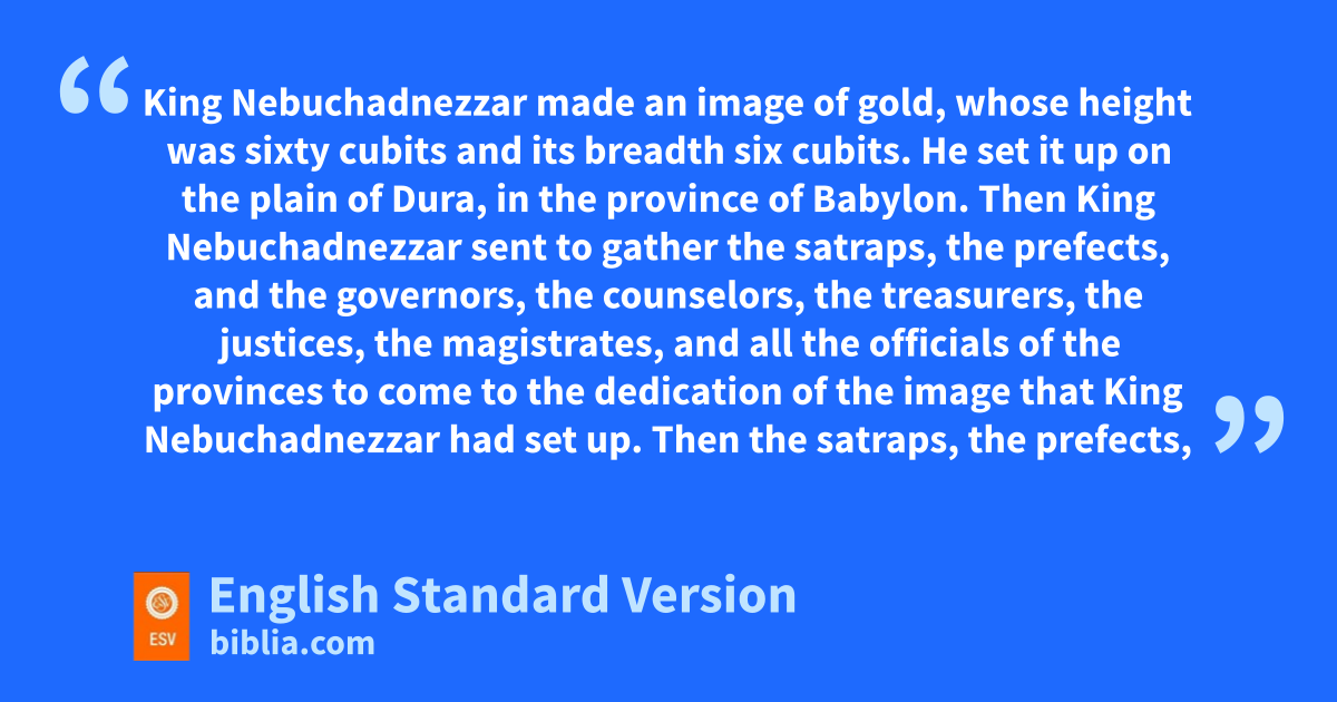 3 King Nebuchadnezzar made an image of gold, whose height was sixty cubits1 and its breadth six cubits. He set it up on uthe plain of Dura, in vthe province of Babylon. 2 Then King Nebuchadnezzar sent to gather wthe satraps, the prefects, and xthe governors, the counselors, the treasurers, the justices, the magistrates, and all the officials of the provinces to come to the dedication of the image that King Nebuchadnezzar had set up. 3 Then wthe satraps, the prefects, and the governors, the counselors, the treasurers, the justices, the magistrates, and all the officials of the provinces gathered for the dedication of the image that King Nebuchadnezzar had set up. And they stood before the image that Nebuchadnezzar had set up. 4 And the herald yproclaimed aloud, “You are commanded, O zpeoples, nations, and languages, 5 that when you hear the asound of the horn, pipe, lyre, trigon, harp, bagpipe, and every kind of music, you bare to fall down and worship the golden image that King Nebuchadnezzar has set up. 6 And whoever does not fall down and worship shall immediately cbe cast into a burning fiery furnace.” 7 Therefore, as soon as all the peoples heard the sound of the horn, pipe, lyre, trigon, harp, bagpipe, and every kind of music, all zthe peoples, nations, and languages fell down and worshiped the golden image that King Nebuchadnezzar had set up.