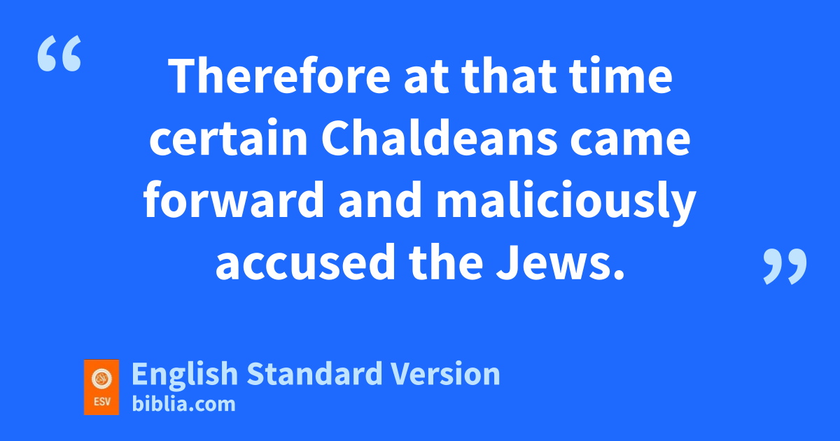 8 Therefore at that time certain dChaldeans ecame forward and maliciously accused the Jews. 9 They declared2 to King Nebuchadnezzar, “O king, live forever! 10 You, O king, fhave made a decree, that every man who ghears the sound of the horn, pipe, lyre, trigon, harp, bagpipe, and every kind of music, gshall fall down and worship the golden image. 11 And whoever does not fall down and worship cshall be cast into a burning fiery furnace. 12 There are certain Jews whom you have happointed over the affairs of vthe province of Babylon: iShadrach, Meshach, and Abednego. These men, O king, jpay no attention to you; they do not serve your gods or worship the golden image that you have set up.”