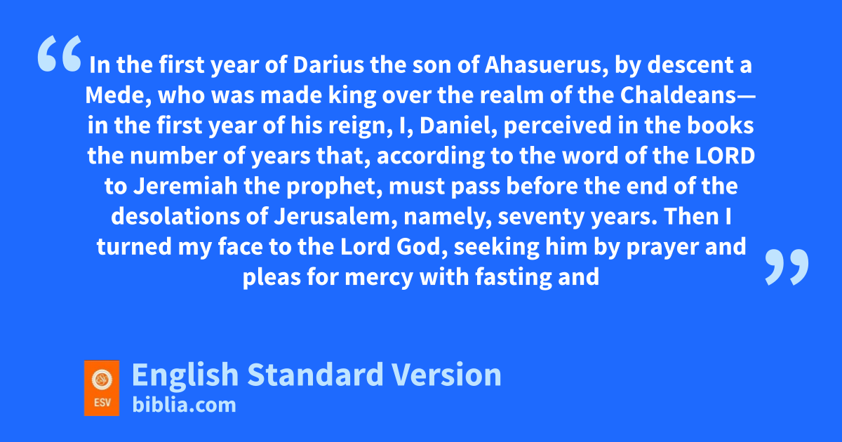 9 bIn the first year of cDarius the son of Ahasuerus, by descent a dMede, who was made king over the realm of the eChaldeans— 2 in the first year of his reign, I, Daniel, perceived in the books the number of years that, according to fthe word of the Lord to Jeremiah the prophet, must pass before the end of the desolations of Jerusalem, namely, seventy years.