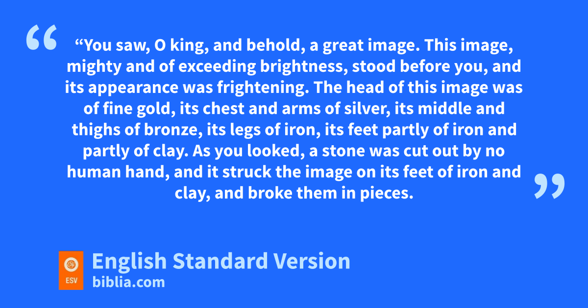 31 “You saw, O king, and behold, a great image. This image, mighty and of exceeding brightness, stood before you, and its appearance was frightening. 32 iThe head of this image was of fine gold, jits chest and arms of silver, its middle and jthighs of bronze, 33 kits legs of iron, its feet partly of iron and partly of clay. 34 As you looked, a stone was cut out lby no human hand, and it struck the image on its feet of iron and clay, and mbroke them in pieces. 35 Then the iron, the clay, the bronze, the silver, and the gold, all together were broken in pieces, and became nlike the chaff of the summer threshing floors; and the wind carried them away, so that onot a trace of them could be found. But the stone that struck the image became pa great mountain qand filled the whole earth.