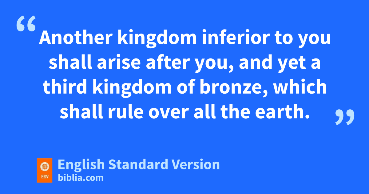 36 “This was the dream. Now we will tell the king its interpretation. 37 You, O king, rthe king of kings, to whom sthe God of heaven thas given the kingdom, the power, and the might, and the glory, 38 and into whose hand he has given, wherever they dwell, the children of man, uthe beasts of the field, and the birds of the heavens, making you rule over them all—you are vthe head of gold. 39 wAnother kingdom inferior to you shall arise after you, and yet a third kingdom vof bronze, xwhich shall rule over all the earth. 40 And ythere shall be a fourth kingdom, strong as iron, because iron zbreaks to pieces and shatters all things. And like iron that crushes, it shall zbreak and crush all these. 41 And as you saw athe feet and toes, partly of potter’s clay and partly of iron, it shall be a divided kingdom, but some of the yfirmness of iron shall be in it, just as you saw iron mixed with the soft clay. 42 And as the toes of the feet were partly iron and partly clay, so the kingdom shall be partly strong and partly brittle. 43 As you saw the iron mixed with soft clay, so they will mix with one another in marriage,3 but they will not hold together, just as iron does not mix with clay. 44 And in the days of those kings bthe God of heaven will set up ca kingdom that shall never be destroyed, nor shall the kingdom be left to another people. dIt shall break in pieces all these kingdoms and bring them to an end, and cit shall stand forever, 45 just as eyou saw that fa stone was cut from a mountain by no human hand, and that dit broke in pieces the iron, the bronze, the clay, the silver, and the gold. A ggreat God has made known to the king what shall be after this. The dream is certain, and its interpretation sure.”