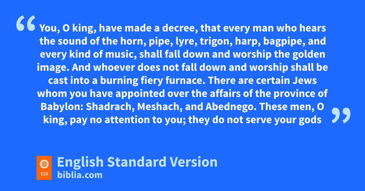 8 Therefore at that time certain dChaldeans ecame forward and maliciously accused the Jews. 9 They declared2 to King Nebuchadnezzar, “O king, live forever! 10 You, O king, fhave made a decree, that every man who ghears the sound of the horn, pipe, lyre, trigon, harp, bagpipe, and every kind of music, gshall fall down and worship the golden image. 11 And whoever does not fall down and worship cshall be cast into a burning fiery furnace. 12 There are certain Jews whom you have happointed over the affairs of vthe province of Babylon: iShadrach, Meshach, and Abednego. These men, O king, jpay no attention to you; they do not serve your gods or worship the golden image that you have set up.”