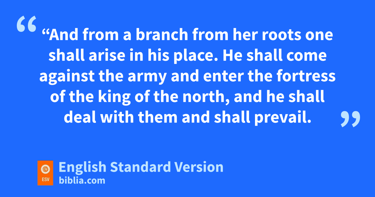 7 “And from a branch from her roots one shall arise in his place. He shall come against the army and enter the dfortress of the king of the north, and he shall deal with them and shall prevail. 8 He shall also carry off to Egypt their gods with their metal images and their precious evessels of silver and gold, and for some years he shall refrain from attacking the king of the north. 9 Then the latter shall come into the realm of the king of the south but shall return to his own land.