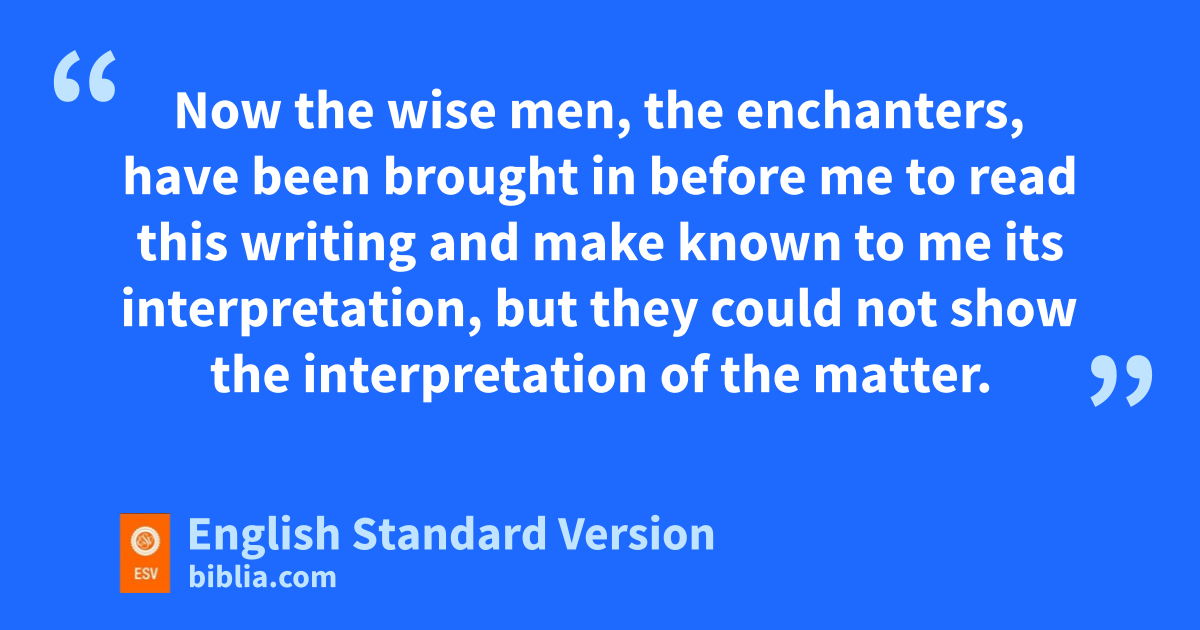13 Then Daniel was brought in before the king. The king answered and said to Daniel, “You are that Daniel, one of ithe exiles of Judah, whom the king my father brought from Judah. 14 I have heard of you that bthe spirit of the gods5 is in you, and that clight and understanding and excellent wisdom are found in you. 15 Now jthe wise men, the kenchanters, have been brought in before me to read this writing and make known to me its interpretation, but lthey could not show the interpretation of the matter. 16 mBut I have heard that you can give interpretations and nsolve problems. oNow if you can read the writing and make known to me its interpretation, oyou shall be clothed with purple and have a chain of gold around your neck and pshall be the third ruler in the kingdom.”