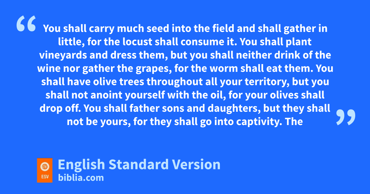 36 “The Lord will kbring you and your king whom you set over you to a nation that neither you lnor your fathers have known. And mthere you shall serve other gods of wood and stone. 37 And you shall become na horror, a proverb, and a byword among all the peoples where the Lord will lead you away. 38 oYou shall carry much seed into the field and shall gather in little, for pthe locust shall consume it. 39 qYou shall plant vineyards and dress them, but you shall neither drink of the wine nor gather the grapes, for the worm shall eat them. 40 You shall have olive trees throughout all your territory, but you rshall not anoint yourself with the oil, for your olives shall drop off. 41 You shall father sons and daughters, but they shall not be yours, for sthey shall go into captivity. 42 pThe cricket3 shall possess all your trees and the fruit of your ground. 43 tThe sojourner who is among you shall rise higher and higher above you, and you shall come down lower and lower. 44 uHe shall lend to you, and you shall not lend to him. tHe shall be the head, and you shall be the tail.