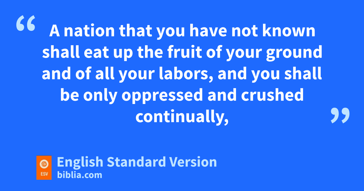 45 v“All these curses shall come upon you and pursue you and overtake you till you are destroyed, because you did not obey the voice of the Lord your God, to keep his commandments and his statutes that he commanded you. 46 They shall be wa sign and a wonder against you and your offspring forever. 47 xBecause you did not serve the Lord your God with joyfulness and gladness of heart, because of the abundance of all things, 48 therefore you shall serve your enemies whom the Lord will send against you, in hunger and thirst, in nakedness, and lacking everything. And he ywill put a yoke of iron on your neck until he has destroyed you. 49 zThe Lord will bring a nation against you from far away, from the end of the earth, aswooping down like the eagle, a nation bwhose language you do not understand, 50 a hard-faced nation cwho shall not respect the old or show mercy to the young. 51 It shall deat the offspring of your cattle and the fruit of your ground, until you are destroyed; it also shall not leave you grain, wine, or oil, the increase of your herds or the young of your flock, until they have caused you to perish.