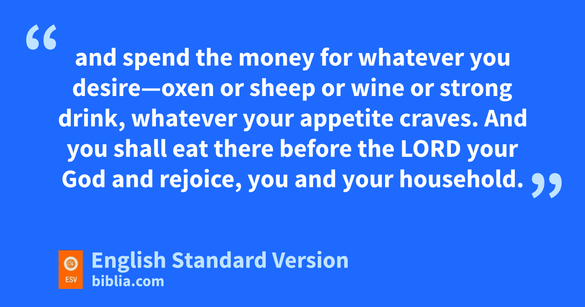 22 a“You shall tithe all the yield of your seed that comes from the field year by year. 23 And before the Lord your God, in the place that he will choose, to make his name dwell there, byou shall eat the tithe of your grain, of your wine, and of your oil, cand the firstborn of your herd and flock, dthat you may learn to fear the Lord your God always. 24 And if the way is too long for you, so that you are not able to carry the tithe, when the Lord your God blesses you, because ethe place is too far from you, which the Lord your God chooses, to set his name there, 25 then you shall turn it into money and bind up the money in your hand and go to the place that the Lord your God chooses 26 and spend the money for whatever you desire—oxen or sheep or wine or strong drink, whatever your appetite craves. And byou shall eat there before the Lord your God and rejoice, you and your household. 27 And you shall not neglect fthe Levite who is within your towns, for ghe has no portion or inheritance with you.