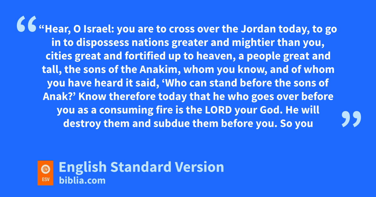 9 “Hear, O Israel: you are vto cross over the Jordan today, to go in to dispossess nations wgreater and mightier than you, cities great and fortified up to heaven, 2 a people great and tall, xthe sons of the Anakim, ywhom you know, and of whom you have heard it said, ‘Who can stand before the sons of Anak?’ 3 Know therefore today that he who zgoes over before you aas a consuming fire is the Lord your God. He will destroy them and subdue them before you. bSo you shall drive them out and make them perish quickly, as the Lord has promised you.