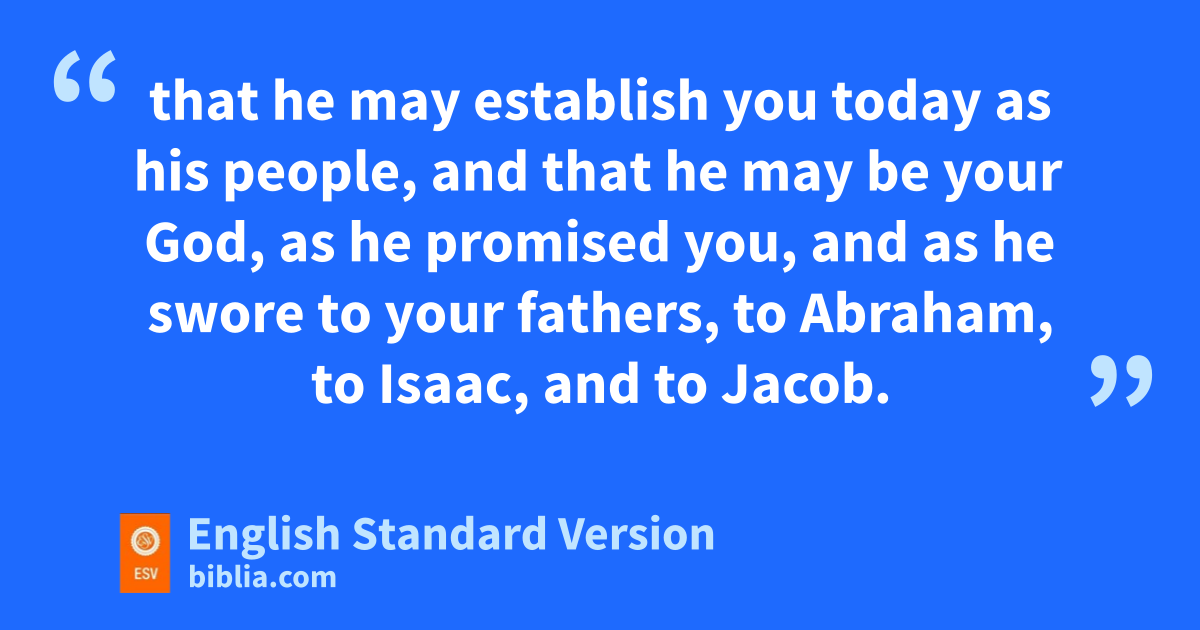 10 “You are standing today, all of you, before the Lord your God: the heads of your tribes,4 your elders, and your officers, all the men of Israel, 11 your little ones, your wives, and the msojourner who is in your camp, from nthe one who chops your wood to the one who draws your water, 12 so that you may enter into the osworn covenant of the Lord your God, which the Lord your God is making with you today, 13 that he may pestablish you today as his people, and that qhe may be your God, as he promised you, and ras he swore to your fathers, to Abraham, to Isaac, and to Jacob. 14 It is not with you alone sthat I am making this sworn covenant, 15 but with whoever is standing here with us today before the Lord our God, tand with whoever is not here with us today.