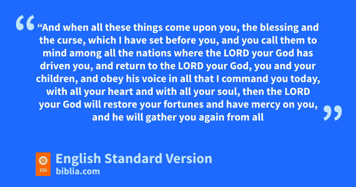 30 h“And iwhen all these things come upon you, the blessing and the curse, which I have set before you, and jyou call them to mind among all the nations where the Lord your God has driven you, 2 and kreturn to the Lord your God, you and your children, and obey his voice in all that I command you today, with all your heart and with all your soul, 3 then the Lord your God lwill restore your fortunes and have mercy on you, and he will mgather you again from all the peoples where the Lord your God has scattered you. 4 nIf your outcasts are in the uttermost parts of heaven, from there the Lord your God will gather you, and from there he will take you. 5 And the Lord your God will bring you into the land that your fathers possessed, that you may possess it. oAnd he will make you more prosperous and numerous than your fathers. 6 And pthe Lord your God will circumcise your heart and the heart of your offspring, qso that you will love the Lord your God with all your heart and with all your soul, that you may live. 7 And the Lord your God will put all these curses on your foes and enemies who persecuted you. 8 And you shall again obey the voice of the Lord and keep all his commandments that I command you today. 9 rThe Lord your God will make you abundantly prosperous in all the work of your hand, in the fruit of your womb and in the fruit of your cattle and in the fruit of your ground. sFor the Lord will again take delight in prospering you, as he took delight in your fathers, 10 when you obey the voice of the Lord your God, to keep his commandments and his statutes that are written in this Book of the Law, when you turn to the Lord your God with all your heart and with all your soul.