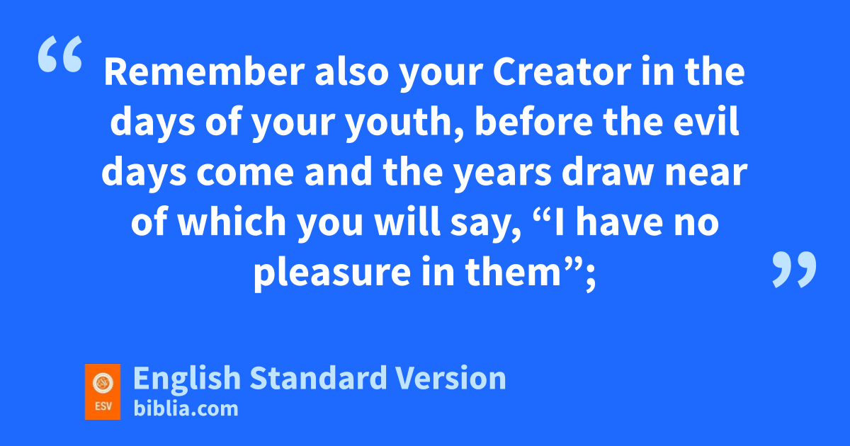 12 Remember also your Creator in vthe days of your youth, before wthe evil days come and the years draw near of which xyou will say, “I have no pleasure in them”; 2 before ythe sun and the light and the moon and the stars are darkened and the clouds return after the rain, 3 in the day when the keepers of the house tremble, and the strong men are bent, and the grinders cease because they are few, and zthose who look through the windows are dimmed, 4 and athe doors on the street are shut—when bthe sound of the grinding is low, and one rises up at the sound of a bird, and all cthe daughters of song are brought low— 5 they are afraid also of what is high, and dterrors are in the way; the almond tree blossoms, the grasshopper drags itself along,1 and desire fails, because man is going to his eeternal fhome, and the gmourners go about the streets— 6 before the silver cord is snapped, or hthe golden bowl is broken, or the pitcher is ishattered at the fountain, or the wheel broken at the cistern, 7 and jthe dust returns to the earth as it was, and kthe spirit returns to God lwho gave it. 8 mVanity2 of vanities, says nthe Preacher; all is vanity.