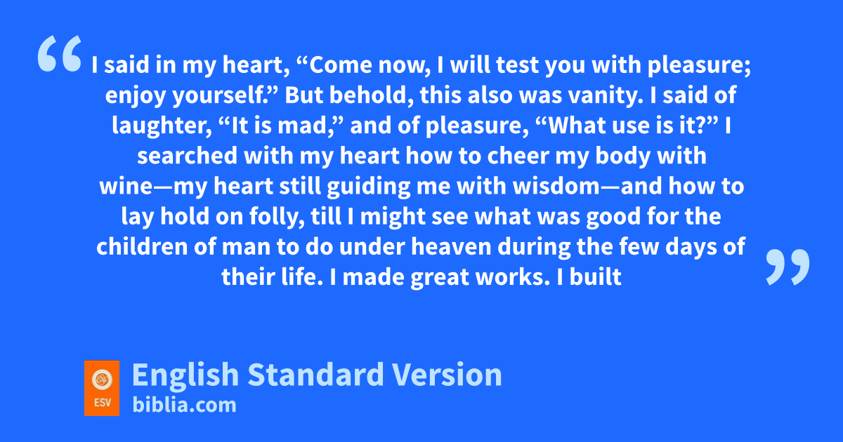 2 I xsaid in my heart, “Come now, I will test you with pleasure; enjoy yourself.” But behold, this also was vanity.1 2 I ysaid of laughter, “It is mad,” and of pleasure, “What use is it?” 3 I zsearched with my heart how to cheer my body with wine—my heart still guiding me with wisdom—and how to lay hold on afolly, till I might see what was good for the children of man to do under heaven during the few days of their life. 4 I made great works. I bbuilt houses and planted cvineyards for myself. 5 I made myself dgardens and parks, and planted in them all kinds of fruit trees. 6 I made myself pools from which to water the forest of growing trees. 7 I bought male and female slaves, and had eslaves who were born in my house. I had also great possessions of fherds and flocks, more than any who had been before me in Jerusalem. 8 I also gathered for myself silver and ggold and the treasure of hkings and iprovinces. I got jsingers, both men and women, and many kconcubines,2 the delight of the sons of man.