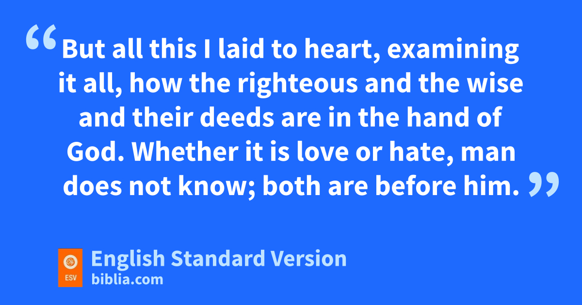 9 But all this I laid to heart, examining it all, chow the righteous and the wise and their deeds are din the hand of God. Whether it is love or hate, man does not know; both are before him. 2 eIt is the same for all, since fthe same event happens to the righteous and the wicked, to the good and the evil,1 to the clean and the unclean, to him who sacrifices and him who does not sacrifice. As the good one is, so is the sinner, and he who gswears is as he who shuns an oath. 3 This is an evil in all that is done under the sun, that ethe same event happens to all. Also, the hearts of the children of man are full of evil, and hmadness is in their hearts while they live, and after that they go to the dead. 4 But he who is joined with all the living has hope, for a living dog is better than a dead lion. 5 For the living know that they will die, but ithe dead know nothing, and they have no more reward, for jthe memory of them is forgotten. 6 Their love and their hate and their envy have already perished, and forever they have no more share in all that is done under the sun.