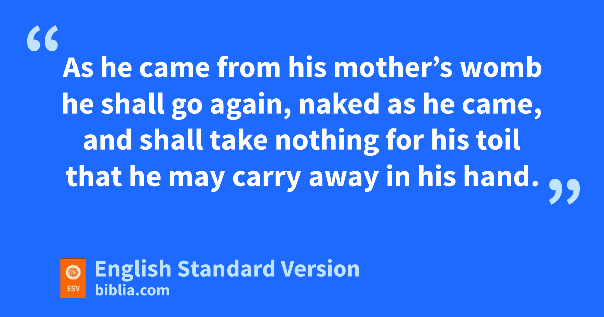 13 cThere is a grievous evil that I have seen under the sun: riches were kept by their owner to his hurt, 14 and those riches were lost in a bad venture. And he is father of a son, but he has nothing in his hand. 15 dAs he came from his mother’s womb he shall go again, naked as he came, and shall take nothing for his toil that he may carry away in his hand. 16 This also is a grievous evil: just as he came, so shall he go, and what egain is there to him who ftoils for the wind? 17 Moreover, all his days he geats in darkness in much vexation and sickness and anger.