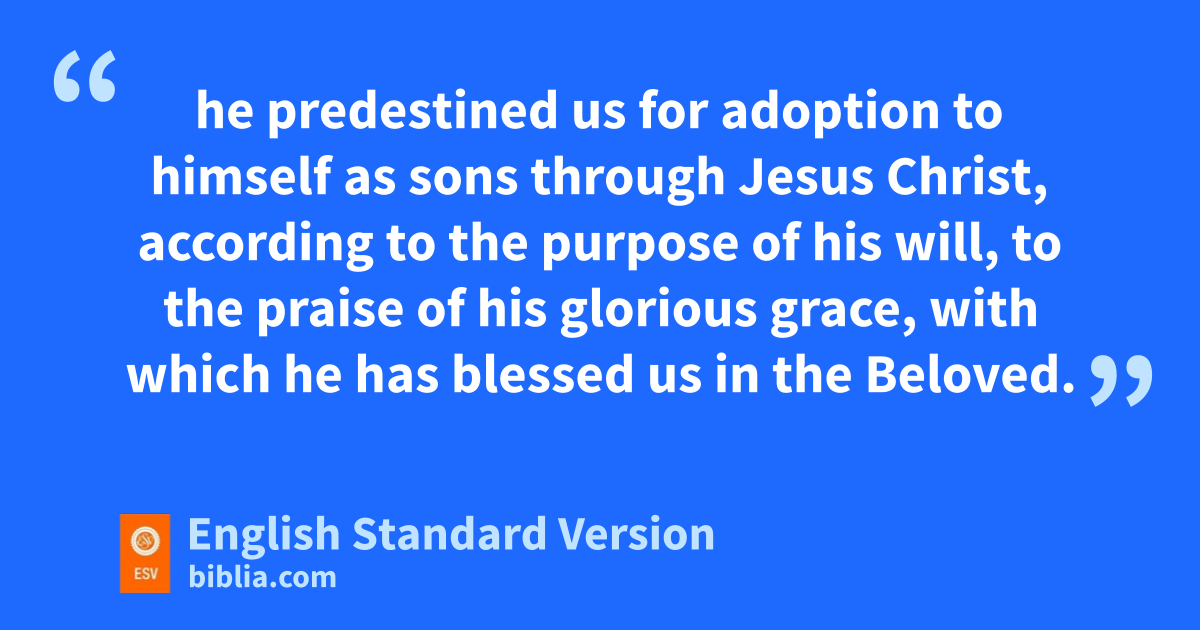 3 eBlessed be fthe God and Father of our Lord Jesus Christ, who has blessed us in Christ with every spiritual blessing gin the heavenly places, 4 heven as he ichose us in him jbefore the foundation of the world, that we should be kholy and blameless before him. In love 5 lhe predestined us2 for madoption to himself as sons through Jesus Christ, naccording to the purpose of his will, 6 oto the praise of his glorious grace, with which he has blessed us in pthe Beloved. 7 qIn him we have rredemption sthrough his blood, tthe forgiveness of our trespasses, uaccording to the riches of his grace, 8 which he lavished upon us, in all wisdom and insight 9 vmaking known3 to us the mystery of his will, naccording to his purpose, which he wset forth in Christ4 10 as a plan for xthe fullness of time, yto unite all things in Christ, things in heaven and things on earth in him.