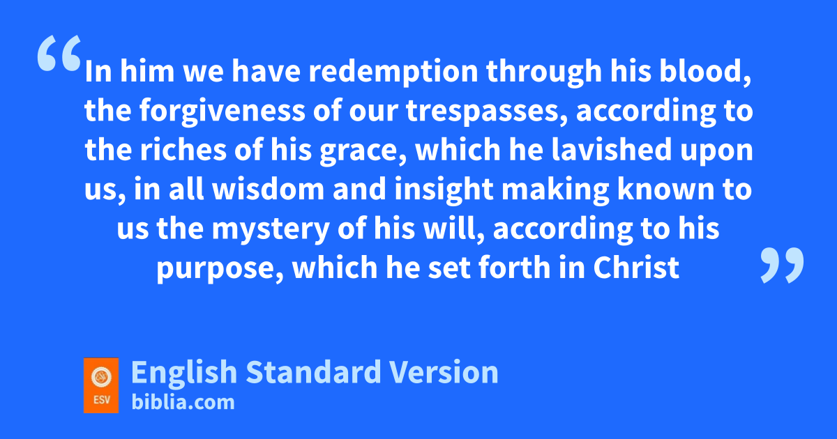 3 eBlessed be fthe God and Father of our Lord Jesus Christ, who has blessed us in Christ with every spiritual blessing gin the heavenly places, 4 heven as he ichose us in him jbefore the foundation of the world, that we should be kholy and blameless before him. In love 5 lhe predestined us2 for madoption to himself as sons through Jesus Christ, naccording to the purpose of his will, 6 oto the praise of his glorious grace, with which he has blessed us in pthe Beloved. 7 qIn him we have rredemption sthrough his blood, tthe forgiveness of our trespasses, uaccording to the riches of his grace, 8 which he lavished upon us, in all wisdom and insight 9 vmaking known3 to us the mystery of his will, naccording to his purpose, which he wset forth in Christ4 10 as a plan for xthe fullness of time, yto unite all things in Christ, things in heaven and things on earth in him.