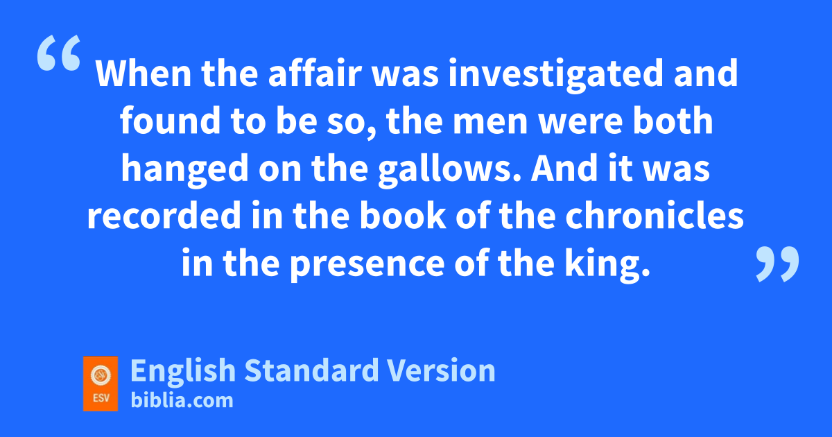 19 Now when the virgins were gathered together ithe second time, Mordecai was sitting jat the king’s gate. 20 kEsther had not made known her kindred or her people, as Mordecai had commanded her, for Esther obeyed Mordecai just las when she was brought up by him. 21 In those days, as Mordecai was sitting at the king’s gate, mBigthan and nTeresh, two of the king’s eunuchs, who guarded the threshold, became angry and sought to lay hands on King Ahasuerus. 22 And this came to the knowledge of Mordecai, oand he told it to Queen Esther, and Esther told the king in the name of Mordecai. 23 When the affair was investigated and found to be so, the men were both hanged on the gallows.3 And it was recorded in pthe book of the chronicles in the presence of the king.