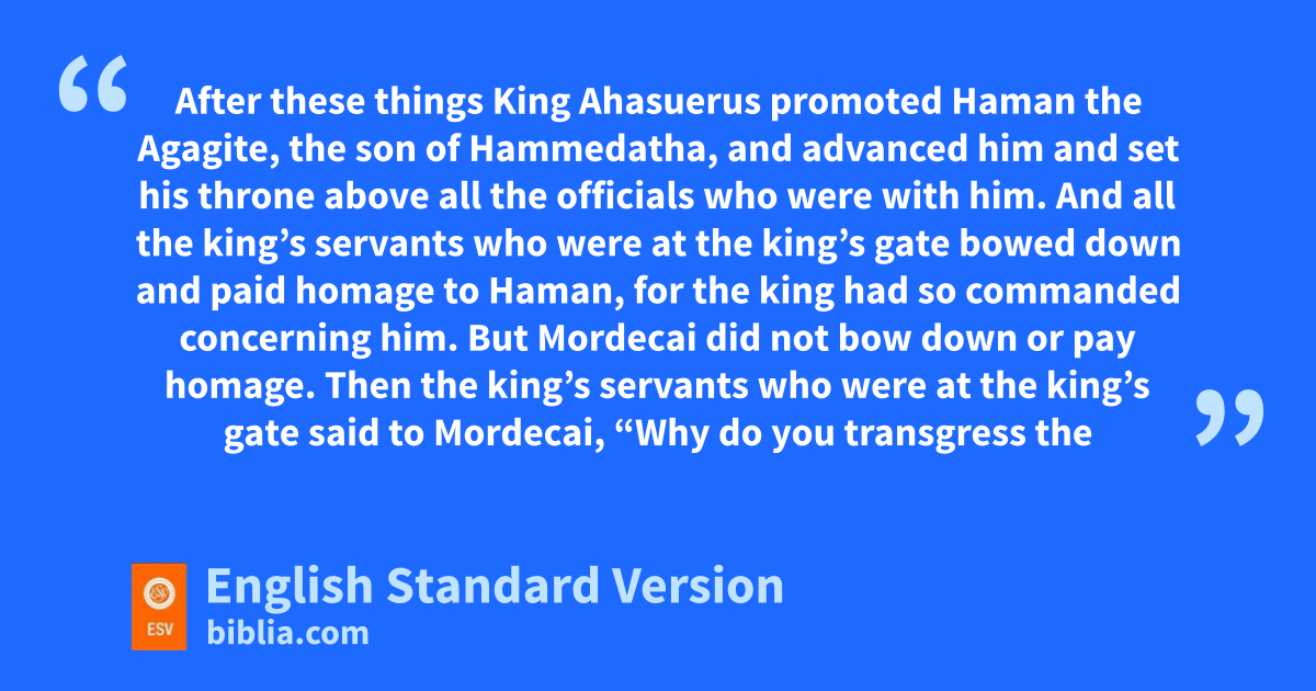 3 After these things King Ahasuerus qpromoted Haman rthe Agagite, the son of Hammedatha, sand advanced him and set his throne above all the officials who were with him. 2 And all the king’s servants who were at the king’s gate bowed down and paid homage to Haman, for the king had so commanded concerning him. tBut Mordecai did not bow down or pay homage. 3 Then the king’s servants who were uat the king’s gate said to Mordecai, “Why do you transgress vthe king’s command?” 4 And when they spoke to him day after day and he would not listen to them, they told Haman, in order to see whether Mordecai’s words would stand, for he had told them that he was a Jew. 5 And when Haman saw that tMordecai did not bow down or pay homage to him, Haman was wfilled with fury. 6 But he disdained1 to lay hands on Mordecai alone. So, as they had made known to him the people of Mordecai, Haman sought to destroy2 all the Jews, the people of Mordecai, throughout the whole kingdom of Ahasuerus.