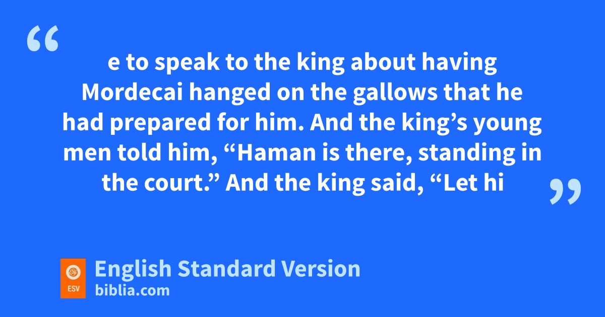 6 On that night the king could not sleep. And he gave orders to bring othe book of memorable deeds, the chronicles, and they were read before the king. 2 And it was found written how pMordecai had told about qBigthana1 and rTeresh, two of the king’s eunuchs, who guarded the threshold, and who had sought to lay hands on King Ahasuerus. 3 And the king said, “What honor or distinction has been bestowed on Mordecai for this?” The king’s young men who attended him said, “Nothing has been done for him.” 4 And the king said, “Who is in the court?” Now Haman had just entered sthe outer court of the king’s palace to speak to the king about having Mordecai hanged on tthe gallows2 that he had prepared for him. 5 And the king’s young men told him, “Haman is there, standing in the court.” And the king said, “Let him come in.” 6 So Haman came in, and the king said to him, “What should be done to the man uwhom the king delights to honor?” And Haman said to himself, “Whom would the king delight to honor more than me?” 7 And Haman said to the king, “For the man whom the king delights to honor, 8 let royal robes be brought, which the king has worn, vand the horse that the king has ridden, and on whose head wa royal crown3 is set. 9 And let the robes and the horse be handed over to one of the king’s most noble officials. Let them dress the man whom the king delights to honor, and let them lead him on the horse through the square of the city, xproclaiming before him: ‘Thus shall it be done to the man whom the king delights to honor.’ ” 10 Then the king said to Haman, “Hurry; take the robes and the horse, as you have said, and do so to Mordecai the Jew, who sits yat the king’s gate. Leave out nothing that you have mentioned.” 11 So Haman took the robes and the horse, and he dressed Mordecai and led him through the square of the city, proclaiming before him, “Thus shall it be done to the man whom the king delights to honor.”