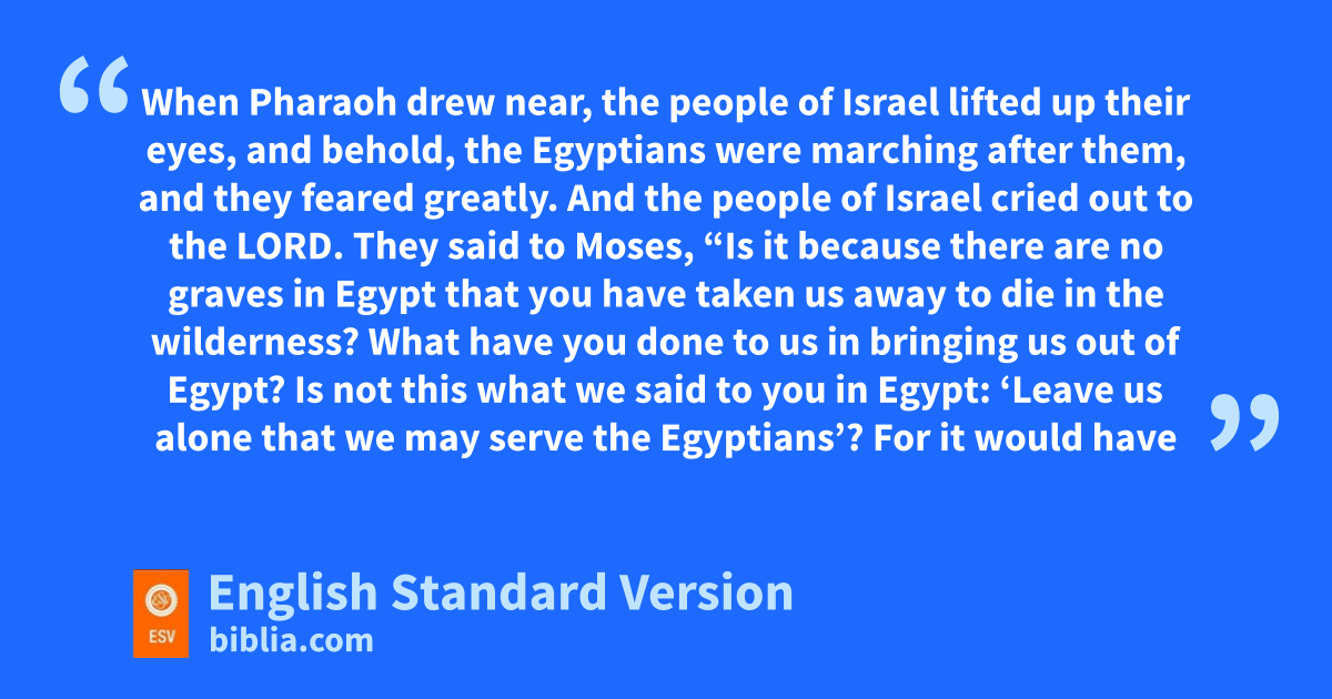 10 When Pharaoh drew near, the people of Israel lifted up their eyes, and behold, the Egyptians were marching after them, and they feared greatly. And the people of Israel dcried out to the Lord. 11 They esaid to Moses, “Is it because there are no graves in Egypt that you have taken us away to die in the wilderness? What have you done to us in bringing us out of Egypt? 12 Is not this what fwe said to you in Egypt: ‘Leave us alone that we may serve the Egyptians’? For it would have been better for us to serve the Egyptians than to die in the wilderness.” 13 And Moses said to the people, g“Fear not, stand firm, and see the salvation of the Lord, which he will work for you today. For hthe Egyptians whom you see today, you shall never see again. 14 iThe Lord will fight for you, and you have only jto be silent.”