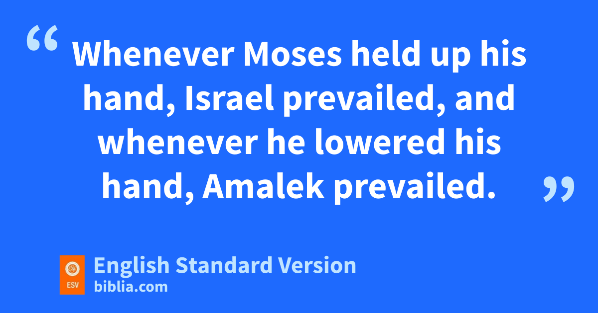 8 fThen Amalek came and fought with Israel at Rephidim. 9 So Moses said to gJoshua, “Choose for us men, and go out and fight with Amalek. Tomorrow I will stand on the top of the hill with hthe staff of God in my hand.” 10 So gJoshua did as Moses told him, and fought with Amalek, while Moses, Aaron, and iHur went up to the top of the hill. 11 Whenever Moses jheld up his hand, Israel prevailed, and whenever he lowered his hand, Amalek prevailed. 12 But Moses’ hands grew weary, so they took a stone and put it under him, and he sat on it, while Aaron and iHur held up his hands, one on one side, and the other on the other side. So his hands were steady until the going down of the sun. 13 And gJoshua overwhelmed Amalek and his people with the sword.