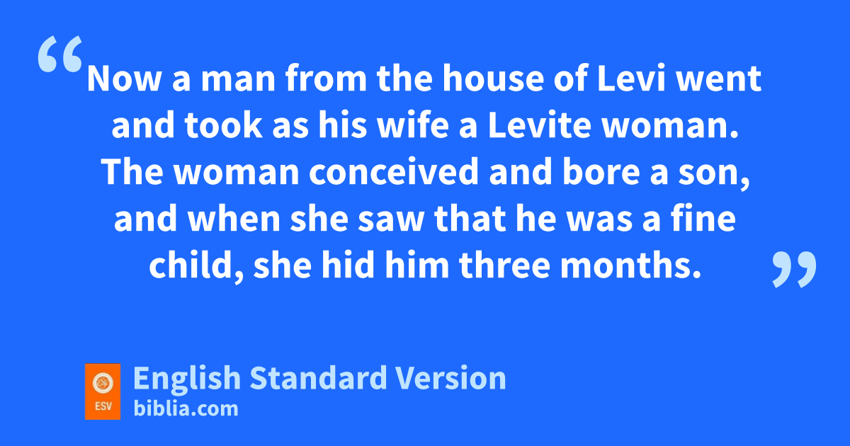 2 Now a tman from the house of Levi went and took as his wife a Levite woman. 2 The woman conceived and bore a son, and uwhen she saw that he was a fine child, she hid him three months. 3 When she could hide him no longer, she took for him a basket made of bulrushes1 and daubed it with bitumen and pitch. She put the child in it and placed it among the vreeds by the river bank. 4 And whis sister stood at a distance to know what would be done to him. 5 Now the daughter of Pharaoh came down to bathe at the river, while her young women walked beside the river. She saw the basket among the reeds and sent her servant woman, and she took it. 6 When she opened it, she saw the child, and behold, the baby was crying. She took pity on him and said, “This is one of the Hebrews’ children.” 7 Then his sister said to Pharaoh’s daughter, “Shall I go and call you a nurse from the Hebrew women to nurse the child for you?” 8 And Pharaoh’s daughter said to her, “Go.” So the girl went and called the child’s mother. 9 And Pharaoh’s daughter said to her, “Take this child away and nurse him for me, and I will give you your wages.” So the woman took the child and nursed him. 10 When the child grew older, she brought him to Pharaoh’s daughter, and he became xher son. She named him Moses, “Because,” she said, “I ydrew him out of the water.”2