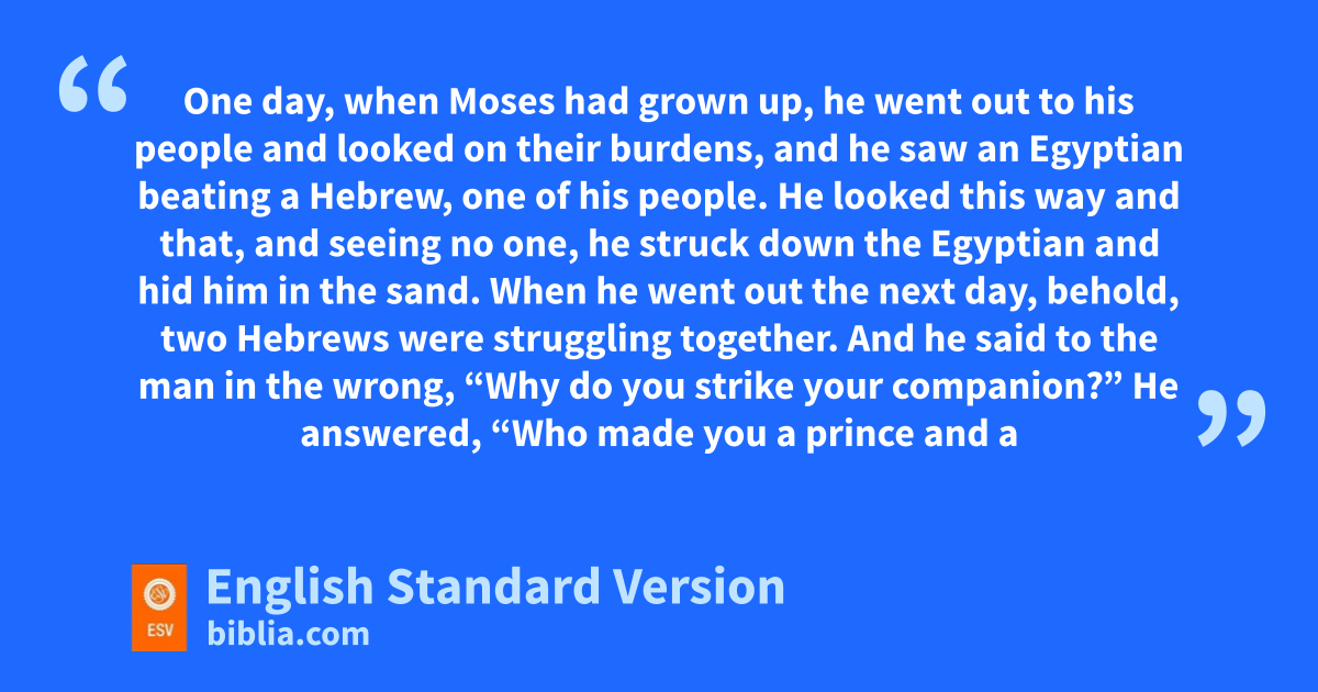 11 One day, zwhen Moses had grown up, he went out to his people and looked on their aburdens, and he saw an Egyptian beating a Hebrew, one of his people.3 12 He looked this way and that, and seeing no one, he bstruck down the Egyptian and hid him in the sand. 13 When che went out the next day, behold, two Hebrews were struggling together. And he said to the man in the wrong, “Why do you strike your companion?” 14 He answered, d“Who made you a prince and a judge over us? Do you mean to kill me as you killed the Egyptian?” Then Moses was afraid, and thought, “Surely the thing is known.” 15 When Pharaoh heard of it, he sought to kill Moses. But eMoses fled from Pharaoh and stayed in the land of Midian. And he sat down by fa well.