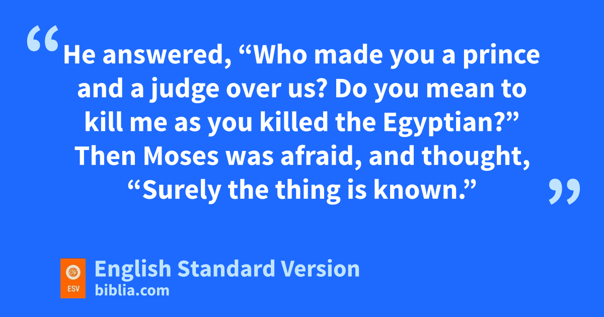 11 One day, zwhen Moses had grown up, he went out to his people and looked on their aburdens, and he saw an Egyptian beating a Hebrew, one of his people.3 12 He looked this way and that, and seeing no one, he bstruck down the Egyptian and hid him in the sand. 13 When che went out the next day, behold, two Hebrews were struggling together. And he said to the man in the wrong, “Why do you strike your companion?” 14 He answered, d“Who made you a prince and a judge over us? Do you mean to kill me as you killed the Egyptian?” Then Moses was afraid, and thought, “Surely the thing is known.” 15 When Pharaoh heard of it, he sought to kill Moses. But eMoses fled from Pharaoh and stayed in the land of Midian. And he sat down by fa well.