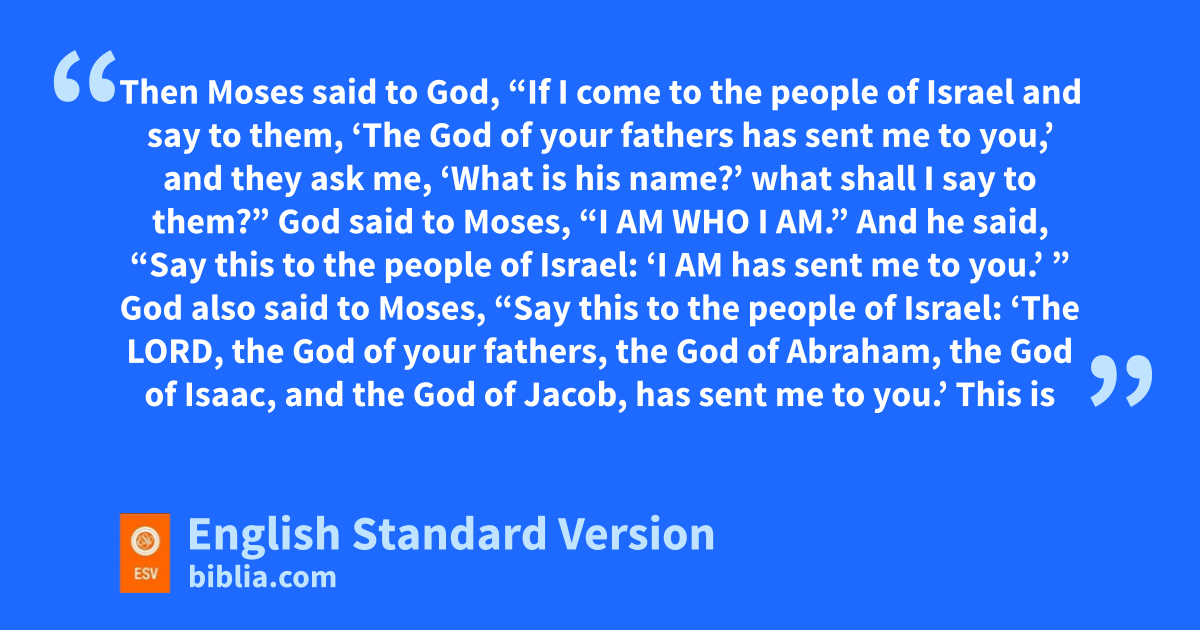13 Then Moses said to God, “If I come to the people of Israel and say to them, ‘The God of your fathers has sent me to you,’ and they ask me, ‘What is his name?’ what shall I say to them?” 14 God said to Moses, “I am who I am.”1 And he said, “Say this to the people of Israel: r‘I am has sent me to you.’ ” 15 God also said to Moses, “Say this to the people of Israel: ‘The Lord,2 the sGod of your fathers, the God of Abraham, the God of Isaac, and the God of Jacob, has sent me to you.’ This is tmy name forever, and thus I am to be remembered throughout all generations. 16 Go and ugather the elders of Israel together and say to them, ‘The Lord, the God of your fathers, the God of Abraham, of Isaac, and of Jacob, has appeared to me, saying, v“I have observed you and what has been done to you in Egypt, 17 and I promise that wI will bring you up out of the affliction of Egypt to the land of the Canaanites, the Hittites, the Amorites, the Perizzites, the Hivites, and the Jebusites, a land wflowing with milk and honey.” ’ 18 And xthey will listen to your voice, and you and the elders of Israel yshall go to the king of Egypt and say to him, ‘The Lord, the God of the Hebrews, has zmet with us; and now, please let us go a three days’ journey into the wilderness, that we may sacrifice to the Lord our God.’ 19 But I know that the king of Egypt awill not let you go unless compelled bby a mighty hand.3 20 So cI will stretch out my hand and strike Egypt with dall the wonders that I will do in it; eafter that he will let you go. 21 And fI will give this people favor in the sight of the Egyptians; and when you go, you shall not go empty, 22 but each woman shall ask of her neighbor, and any woman who lives in her house, for gsilver and gold jewelry, and for clothing. You shall put them on your sons and on your daughters. So hyou shall plunder the Egyptians.”