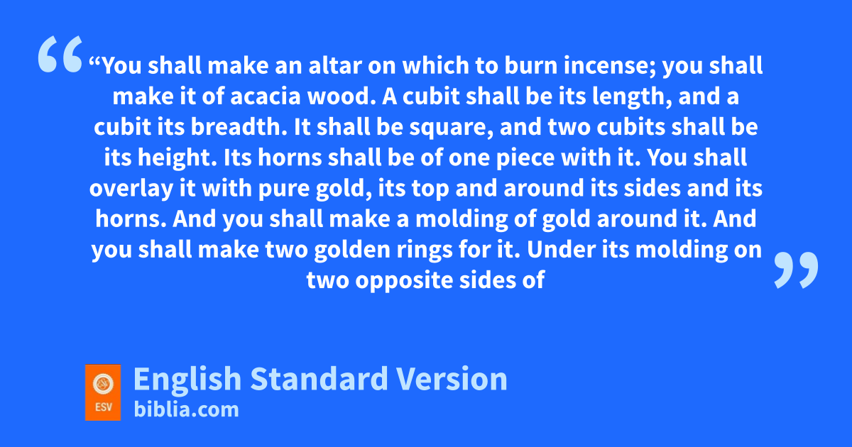 30 j“You shall make kan altar on which to burn incense; you shall make it of acacia wood. 2 A cubit1 shall be its length, and a cubit its breadth. It shall be square, and two cubits shall be its height. lIts horns shall be of one piece with it. 3 You shall moverlay it with pure gold, its top and around its sides and its horns. And you shall make a molding of gold around it. 4 And you shall make two golden rings for it. Under its molding on two opposite sides of it you shall make them, and they shall be nholders for poles with which to carry it. 5 You shall make the poles of acacia wood and overlay them with gold. 6 And you shall put it in front of the veil that is above the ark of the testimony, in front of the omercy seat that is above the testimony, where I will meet with you. 7 And Aaron shall pburn fragrant incense on it. Every morning when he qdresses the lamps he shall burn it, 8 and when Aaron sets up the lamps at twilight, he shall burn it, a regular incense offering before the Lord throughout your generations. 9 You shall not offer runauthorized incense on it, or a burnt offering, or a grain offering, and you shall not pour a drink offering on it. 10 sAaron shall make atonement on its horns once a year. With the blood of the tsin offering of atonement he shall make atonement for it once in the year throughout your generations. It is most holy to the Lord.”
