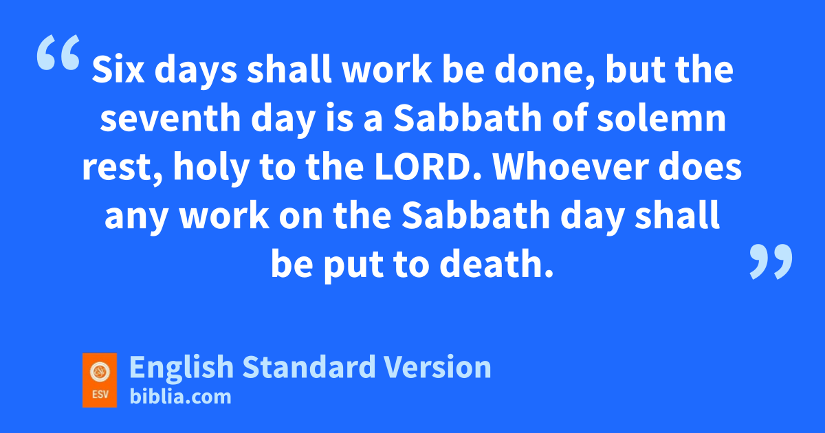 12 And the Lord said to Moses, 13 “You are to speak to the people of Israel and say, ‘Above all you shall keep my Sabbaths, for this is a sign between me and you throughout your generations, that you may know that I, the Lord, sanctify you. 14 You shall keep the Sabbath, because it is holy for you. Everyone who profanes it shall be put to death. nWhoever does any work on it, that soul shall be cut off from among his people. 15 oSix days shall work be done, but pthe seventh day is a Sabbath of solemn rest, holy to the Lord. nWhoever does any work on the Sabbath day shall be put to death. 16 Therefore the people of Israel shall keep the Sabbath, observing the Sabbath throughout their generations, as a covenant forever. 17 qIt is a sign forever between me and the people of Israel that rin six days the Lord made the heavens and the earth, and son the seventh day he rested and was refreshed.’ ”