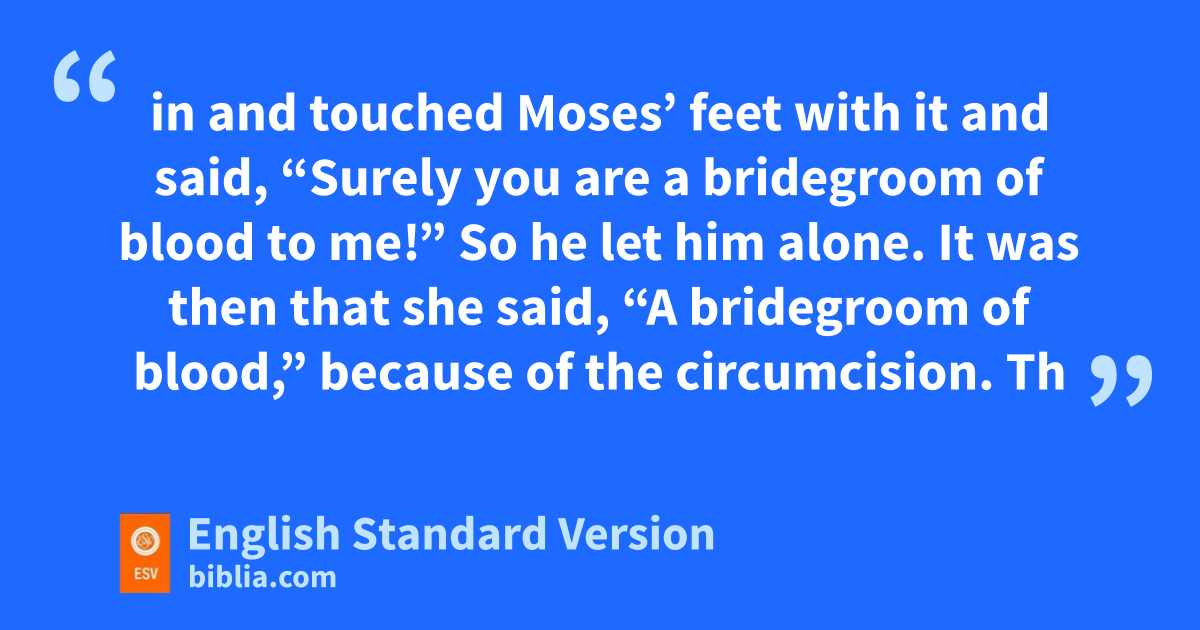 24 At a lodging place on the way fthe Lord met him and gsought to put him to death. 25 Then hZipporah took a iflint and cut off her son’s foreskin and touched Moses’3 feet with it and said, “Surely you are a bridegroom of blood to me!” 26 So he let him alone. It was then that she said, “A bridegroom of blood,” because of the circumcision.