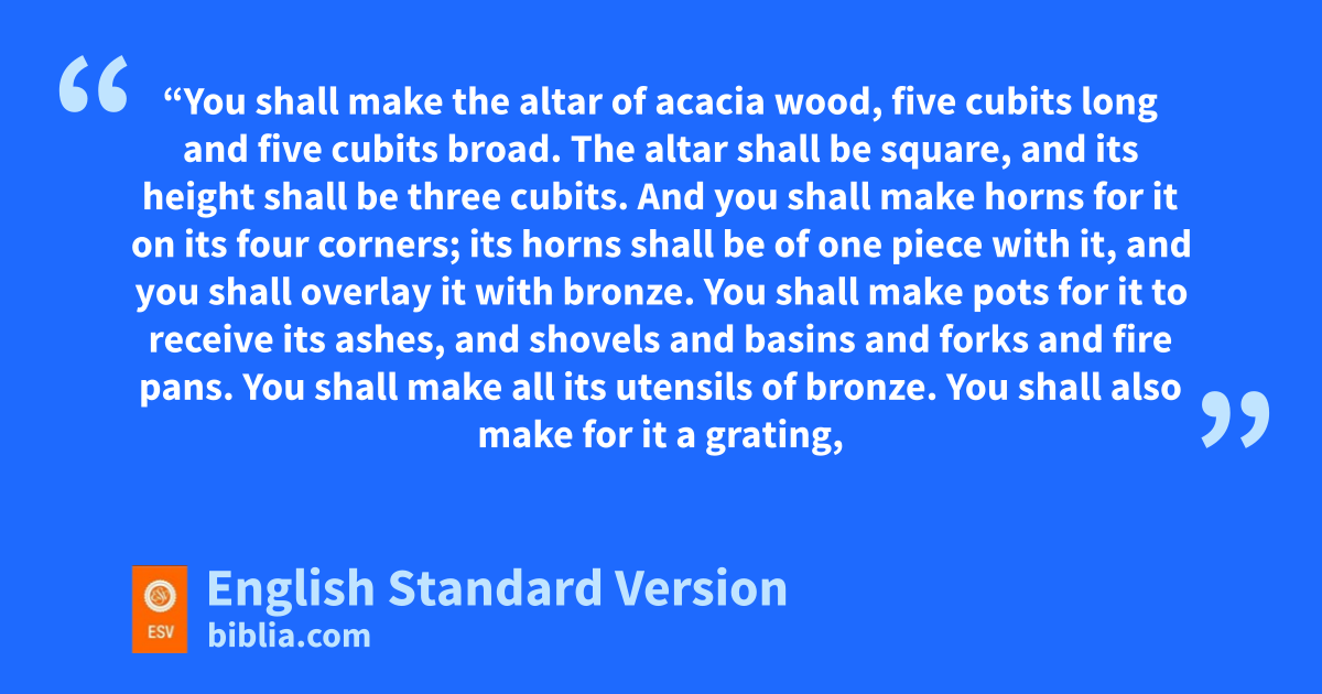 27 “You shall make the naltar of acacia wood, five cubits1 long and five cubits broad. The altar shall be square, and its height shall be three cubits. 2 And you shall make ohorns for it on its four corners; its horns shall be of one piece with it, and pyou shall overlay it with bronze. 3 You shall make pots for it to receive its ashes, and shovels and basins and qforks and fire pans. You shall make all its utensils of bronze. 4 You shall also make for it a grating, a network of bronze, and on the net you shall make four bronze rings at its four corners. 5 And you shall set it under the ledge of the altar so that the net extends halfway down the altar. 6 And you shall make poles for the altar, poles of acacia wood, and overlay them with bronze. 7 And the poles shall be put through the rings, so that the poles are on the two sides of the altar when it is carried. 8 You shall make it hollow, with boards. rAs it has been shown you on the mountain, so shall it be made.