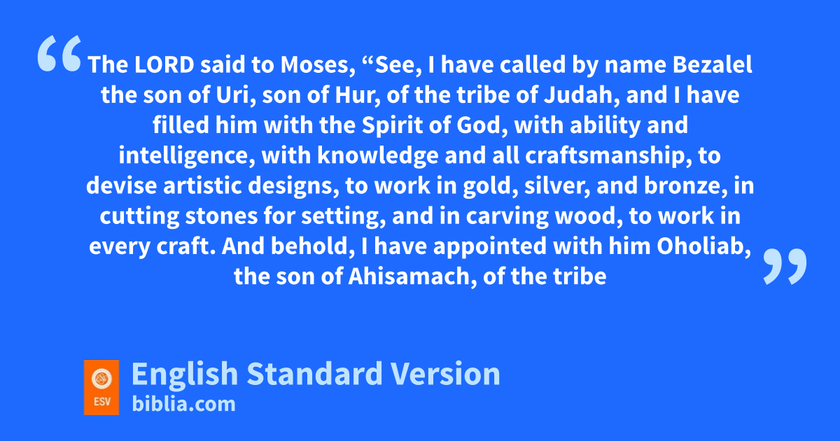 31 The Lord said to Moses, 2 “See, I have called by name xBezalel the son of Uri, son of yHur, of the tribe of Judah, 3 and I have zfilled him with the Spirit of God, with ability and intelligence, with knowledge and all craftsmanship, 4 to devise artistic designs, to work in gold, silver, and bronze, 5 in cutting stones for setting, and in carving wood, to work in every craft. 6 And behold, I have appointed with him aOholiab, the son of Ahisamach, of the tribe of Dan. And I have given to all able men bability, that they may make all that I have commanded you: 7 cthe tent of meeting, and dthe ark of the testimony, and ethe mercy seat that is on it, and all the furnishings of the tent, 8 fthe table and its utensils, and gthe pure lampstand with all its utensils, and hthe altar of incense, 9 and ithe altar of burnt offering with all its utensils, and jthe basin and its stand, 10 and kthe finely worked garments,1 the holy garments for Aaron the priest and the garments of his sons, for their service as priests, 11 and lthe anointing oil and the fragrant mincense for the Holy Place. According to all that I have commanded you, they shall do.”