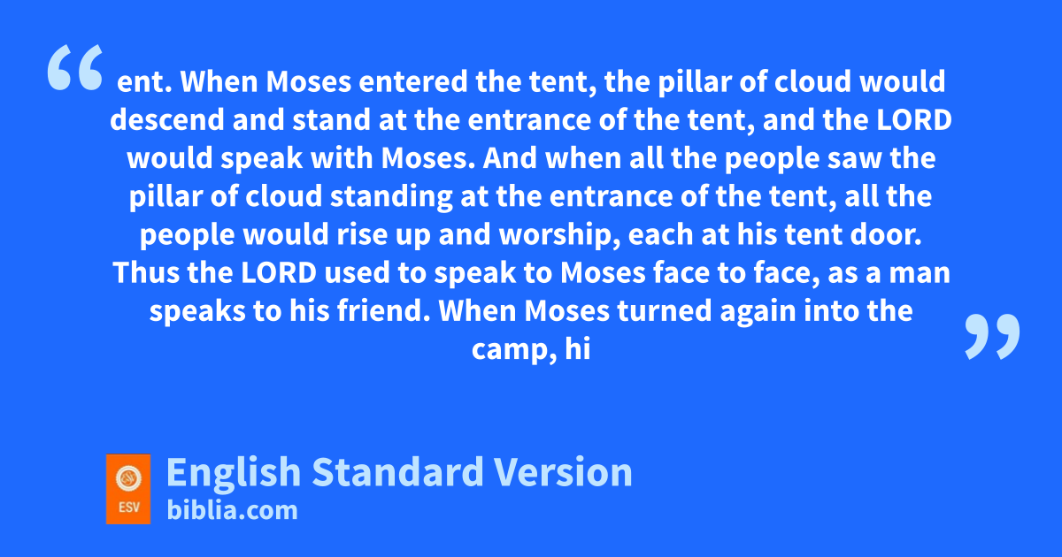 7 Now Moses used to take the tent and pitch it outside the camp, far off from the camp, and zhe called it the tent of meeting. And everyone who asought the Lord would go out to the tent of meeting, which was outside the camp. 8 Whenever Moses went out to the tent, all the people would rise up, and beach would stand at his tent door, and watch Moses until he had gone into the tent. 9 When Moses entered the tent, the cpillar of cloud would descend and stand at the entrance of the tent, and the Lord1 would speak with Moses. 10 And when all the people saw the pillar of cloud standing at the entrance of the tent, all the people would rise up and worship, each at his tent door. 11 Thus dthe Lord used to speak to Moses face to face, as a man speaks to his friend. When Moses turned again into the camp, his eassistant Joshua the son of Nun, a young man, would not depart from the tent.