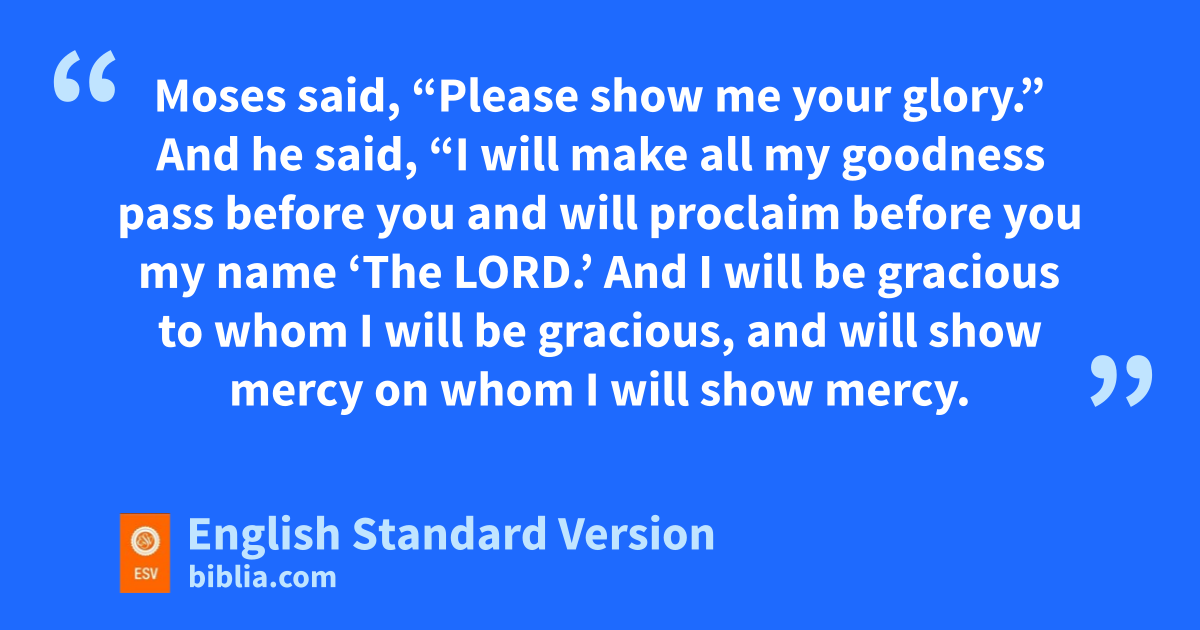 17 And the Lord said to Moses, “This very thing that you have spoken I will do, ofor you have found favor in my sight, and I know you by name.” 18 Moses said, “Please pshow me your glory.” 19 And he said, q“I will make all my goodness pass before you and will proclaim before you my name ‘The Lord.’ And rI will be gracious to whom I will be gracious, and will show mercy on whom I will show mercy. 20 But,” he said, “you cannot see my face, for sman shall not see me and live.” 21 And the Lord said, “Behold, there is a place by me where you shall stand on the rock, 22 and while my glory passes by I will put you in a tcleft of the rock, and I will ucover you with my hand until I have passed by. 23 Then I will take away my hand, and you shall see my back, but my face shall vnot be seen.”